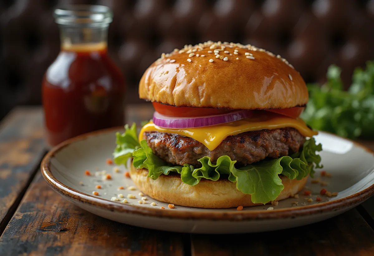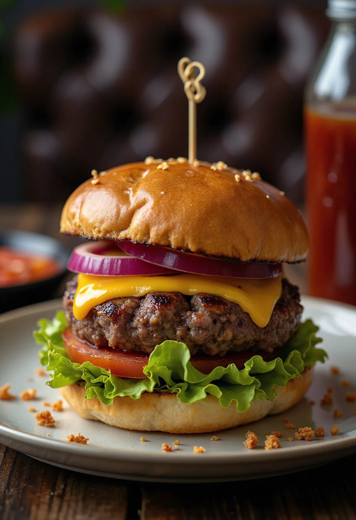 ประกอบแฮมเบอร์เกอร์: วางผักสลัดบนขนมปังล่าง (ป้องกันความชื้นให้ขนมปัง) ตามด้วยเนื้อโปะชีส มะเขือเทศ หอมแดง ราดซอสมะเขือเทศ มัสตาร์ด และปิดด้วยขนมปังบน